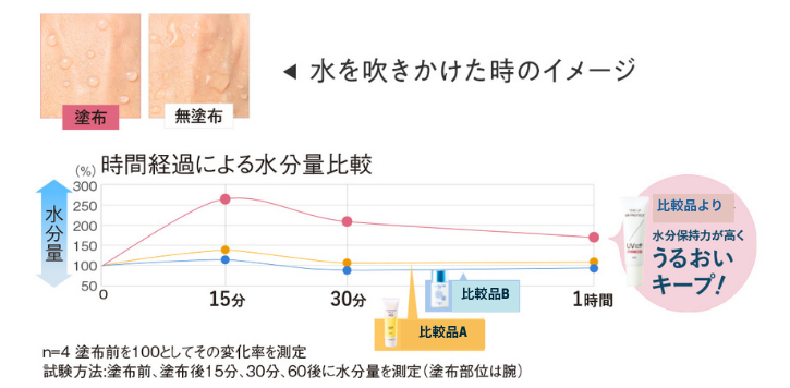 汗をはじくウォータープルーフ効果とみずみずしい保湿効果を両立し、紫外線から肌を守りうるおいも持続します。