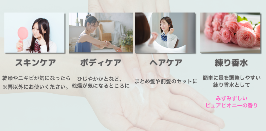 ピゥ うるさらフレグランスクリームは、スキンケアはもちろん、ヘアケア、ボディケア、そして練り香水としても使用できます。