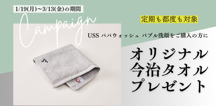 2026年1月19日(月)~3月13日(金)の期間、定期・都度問わず「USSパパウォッシュバブル洗顔〈詰め替え〉」を1点購入ごとに、USSオリジナルハンドタオルを1点プレゼント!
